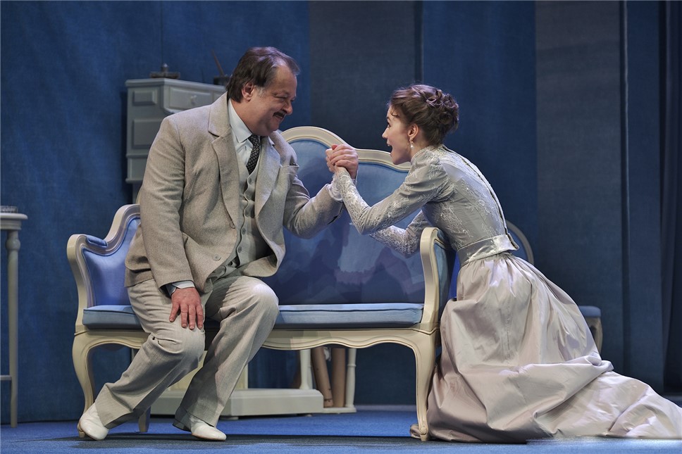 Замечательный, опытнейший театральный художник Стефания Граурогкайте давно сотрудничает с акимовским театром. Историю про господина Альфонса она оформила с филигранным изяществом, применив «говорящие» цвета и выразительные смысловые оттенки. Сдержанный пыльно-голубой превалирует, мягкий кремово-белый служит окантовкой декорации и малочисленных, чисто функциональных предметов мебели и реквизита. Умеренность и аккуратность обстановки дома состоятельного господина де Монтеглена (непривычно сдержанный, академично деликатный Николай Смирнов) рифмуется с его терпеливым характером и мудростью, но при всей доброте душевной демонстрирует внутреннюю силу настоящего мужчины, защитника и покровителя. Он — наш герой. Он с непоколебимой решимостью и непробиваемым спокойствием становится надеждой и опорой и супруге своей Раймонде (трепетная, импульсивная Анастасия Бородихина), и дочери ее Адриенне (очаровательная, непосредственная Настя Сайко). Он обеим заменяет заботливого отца и становится другом и покровителем. Потому что умеет и готов понять, простить, принять. И потому что для него любовь — это поступки.