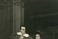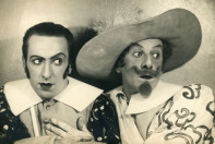«О премьере «Собаки на сене» тоже сообщала не сухая рекламная афиша, а афиша-плакат, где на фоне распахнутого, как бы безграничного горизонта художник набросал легкими, графически четкими штрихами стройную женскую фигурку, устремленную вперед, и рядом – строгий силуэт собаки. Эта элегантная, просветленная афиша, изящно выполненная, не обманула обещаний: зрители увидели зрелище народное, остроумное, жизнерадостное. Режиссер, погрузивший в хитросплетения занимательной интриги, центром которой была прекрасная графиня Диана, влюбленная в своего секретаря Теодоро, изобретательно обыграл ситуации легкого обмана, эффектных случайностей, переодеваний, а художник создал для героев Лопе де Вега открытый, залитый солнцем интерьер с балюстрадами, террасами южного сада, с морем на заднем плане.