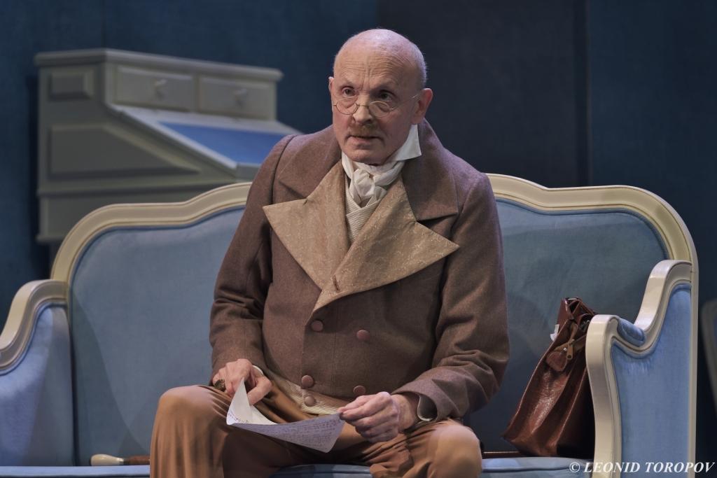 Один из самых ярких характеров спектакля – госпожа Гишар (Елена Мелешкова). Она бурей врывается на сцену, облаченная в красное платье, которое так не вписывается в спокойную синеву дома. Грубоватая, деспотичная и скандальная невеста Октава становится инородным элементом среди других персонажей, воплощающих высшее общество. Она кричит, жадными глотками пьет пиво и не стесняется бросаться туфлями в своего жениха. Образ кажется отталкивающим и комичным, но мощная энергетика самой актрисы подсказывает – все не так однозначно.